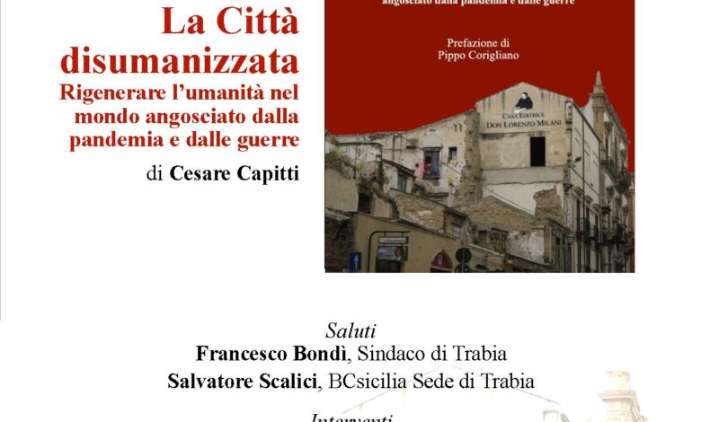 Nell’ambito dell’iniziativa “30 Libri in 30 Giorni”, promossa da BCsicilia, si presenta mercoledì 10 aprile 2024 alle ore 17,00 presso il Centro Sociale “S. Chirchirillo” (ex Case Sanfilippo) in via La Masa a Trabia, il volume di Cesare Capitti “La Città disumanizzata. Rigenerare l’umanità nel mondo angosciato dalla pandemia e dalle guerre”. Dopo i saluti di Francesco Bondì, Sindaco di Trabia, e di Salvatore Scalici, della Sede di Trabia di BCsicilia, sono previsti gli interventi di Giuseppe Savagnone, Storico e Docente di Dottrina sociale della chiesa, e Rino Beringheli, Direttore regionale dell’Urbanistica. Sarà presente l’Autore, Coordina Alfonso Lo Cascio, Presidente regionale di BCsicilia. L’incontro è organizzato dal Comune di Trabia, da BCsicilia e dalla Casa editrice Don Lorenzo Milani con il patrocinio della Regione Siciliana.